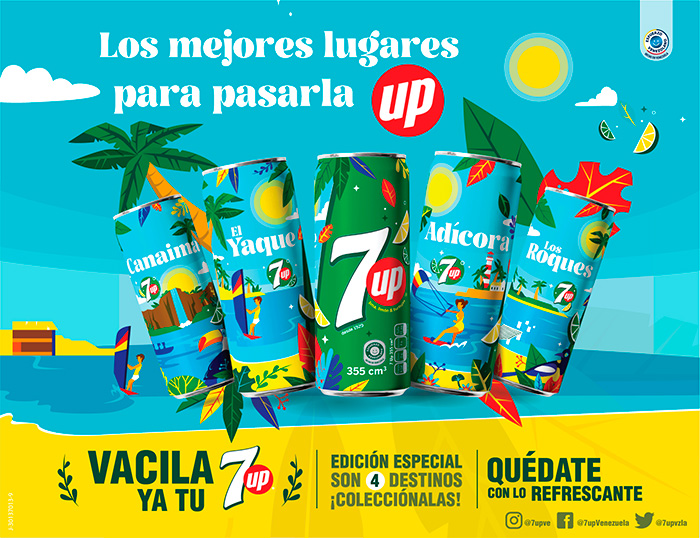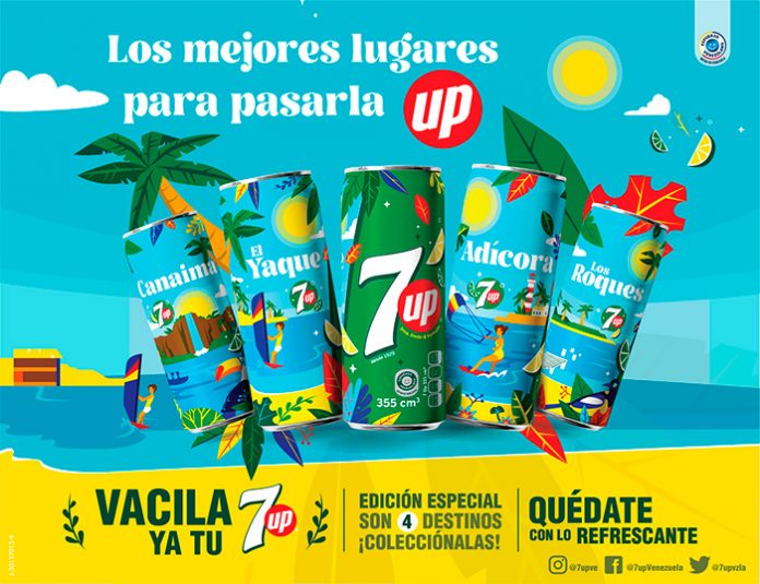 Como parte del despliegue de la campaña, 7up presentará una edición especial de cuatro latas y etiquetas para su empaque de 2 litros, con cuatro motivos inspirados en Los Roques, Canaima, Playa El Yaque y Adícora.