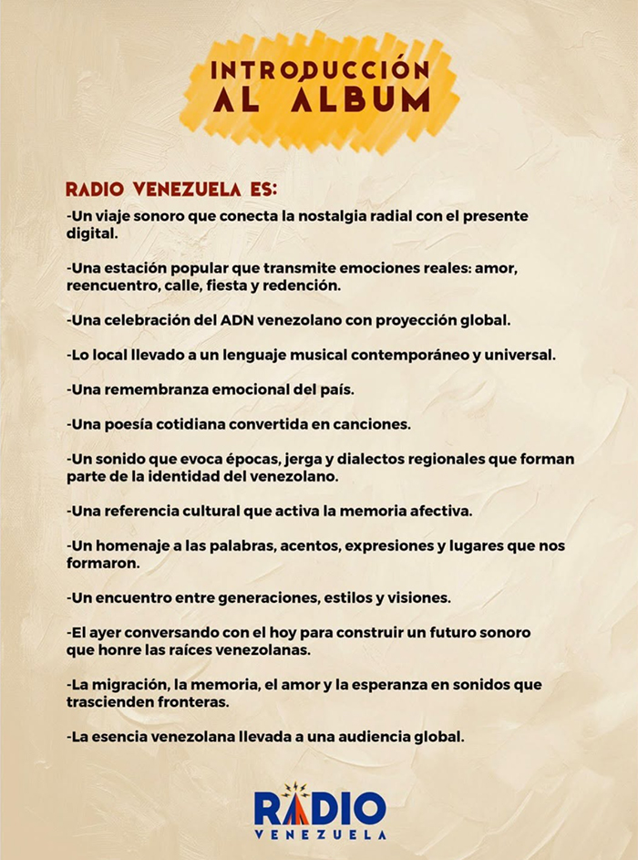 Cuando Chyno y Nacho comenzaron su carrera, la representación venezolana en el mundo era escasa. Las colaboraciones apuntaban casi siempre hacia Puerto Rico. Hoy, los artistas que forman parte de este disco llegaron por voluntad propia, movidos por una deuda de gratitud: Chyno y Nacho abrieron el camino para que una nueva generación de venezolanos conquistara el mapa musical global. Radio Venezuela es la prueba de que esa élite existe, que está unida, y que tiene algo profundo que decir.