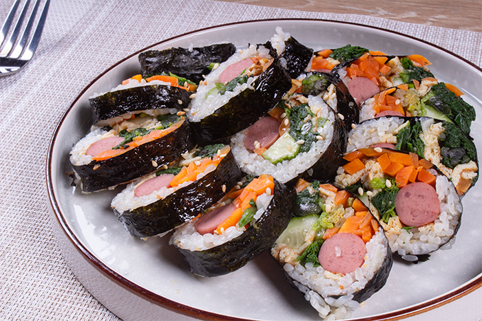 - Kimbap, el famoso roll coreano envuelto en alga, relleno de arroz, vegetales y proteína, ideal para compartir.