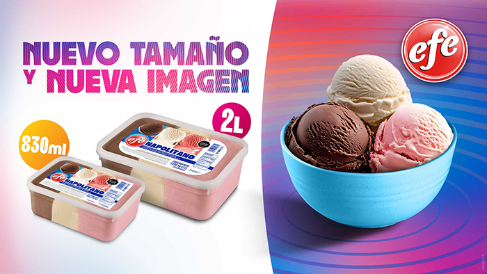 El helado Napolitano de Efe —con sus tres sabores clásicos: mantecado, fresa y chocolate— estrena presentación de 830 ml. Una versión más pequeña y práctica para seguir compartiendo lo bueno, cuando y donde quieras.