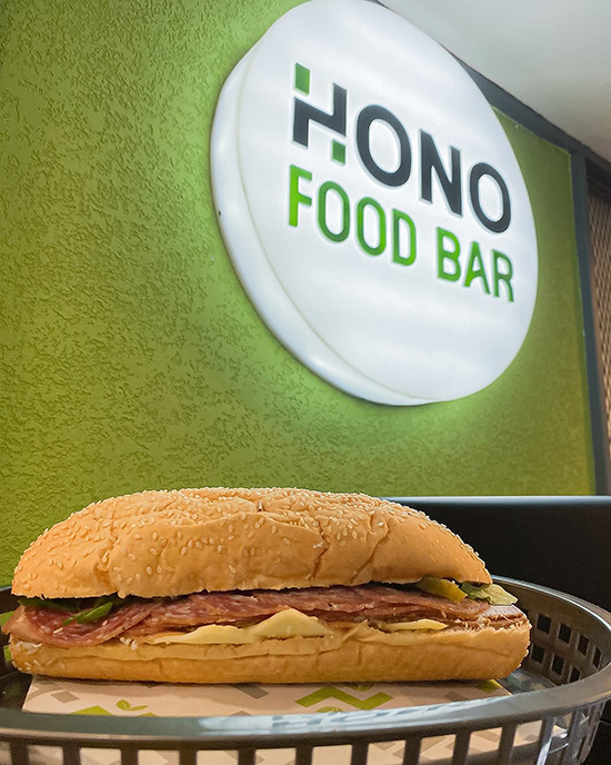 Comida gastronómica bajas en calorías, ideal para los que optan por el menú sano y nutritivo, es parte de la carta de presentación que recibes en Hono Food Bar, sándwiches, wraps y ensaladas es parte del menú principal que puedes deleitar en sus instalaciones.