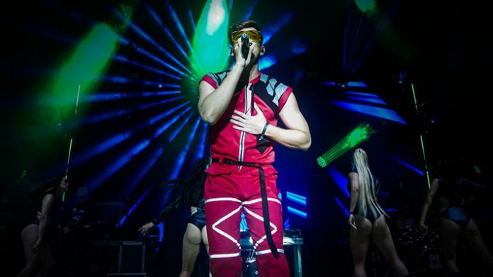 El cantante contó con ocho bailarines en escena, dos coristas, banda completa, un gran juego de luces, buenas visuales y mucha pirotecnia. Mientras que su vestuario rojo resaltó en la tarima.
